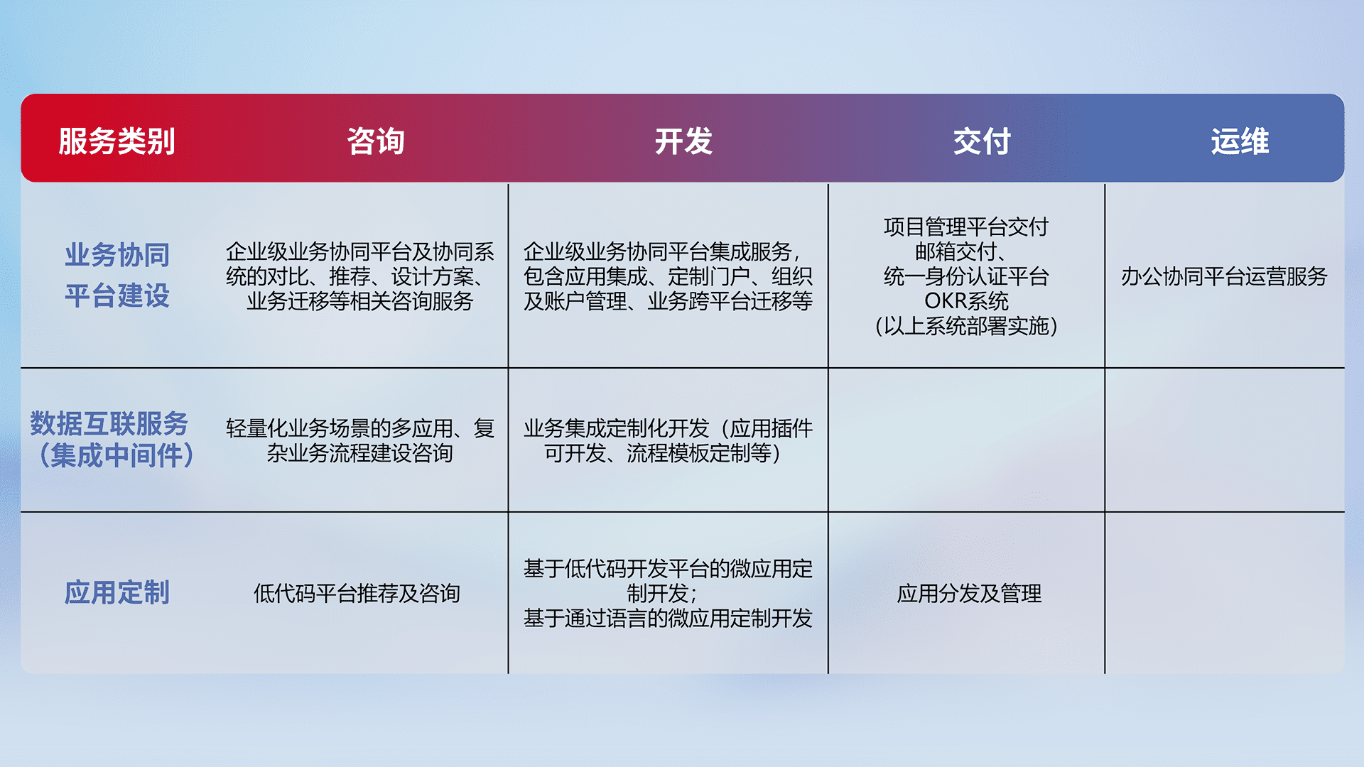 针对钉钉、、、、企微、、IDaas等平台级产品提供产品的规划、、方案、、、、交付、、定制化开发等服务,,,实现如统一协同办公、、智能客户服务、、混合会议管理、、智能数据查询、、、、等业务场景,,实现数字化转型。。