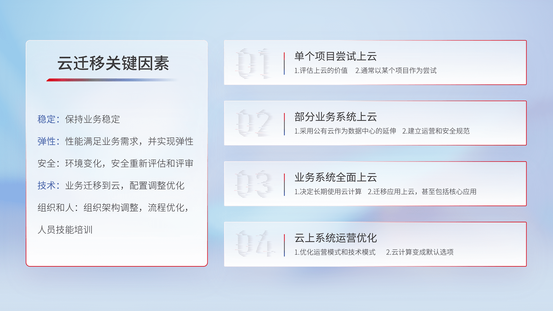 结合实际业务,,,从规划设计、、云平台选型、、、云原生改造、、、、数据迁移、、、集成交付,,,迁移全过程为客户识别最佳上云路径,,,,做好风险识别管理,,设计网络架构、、身份权限、、、、安全审计合规、、操作审计、、日志审计、、、监控告警策略、、多站点容灾设计等,,对云上基础设施进行整体规划,,,提升IT治理水平,,,以满足弹性、、、、高可用、、、、高性能的需求。。。。