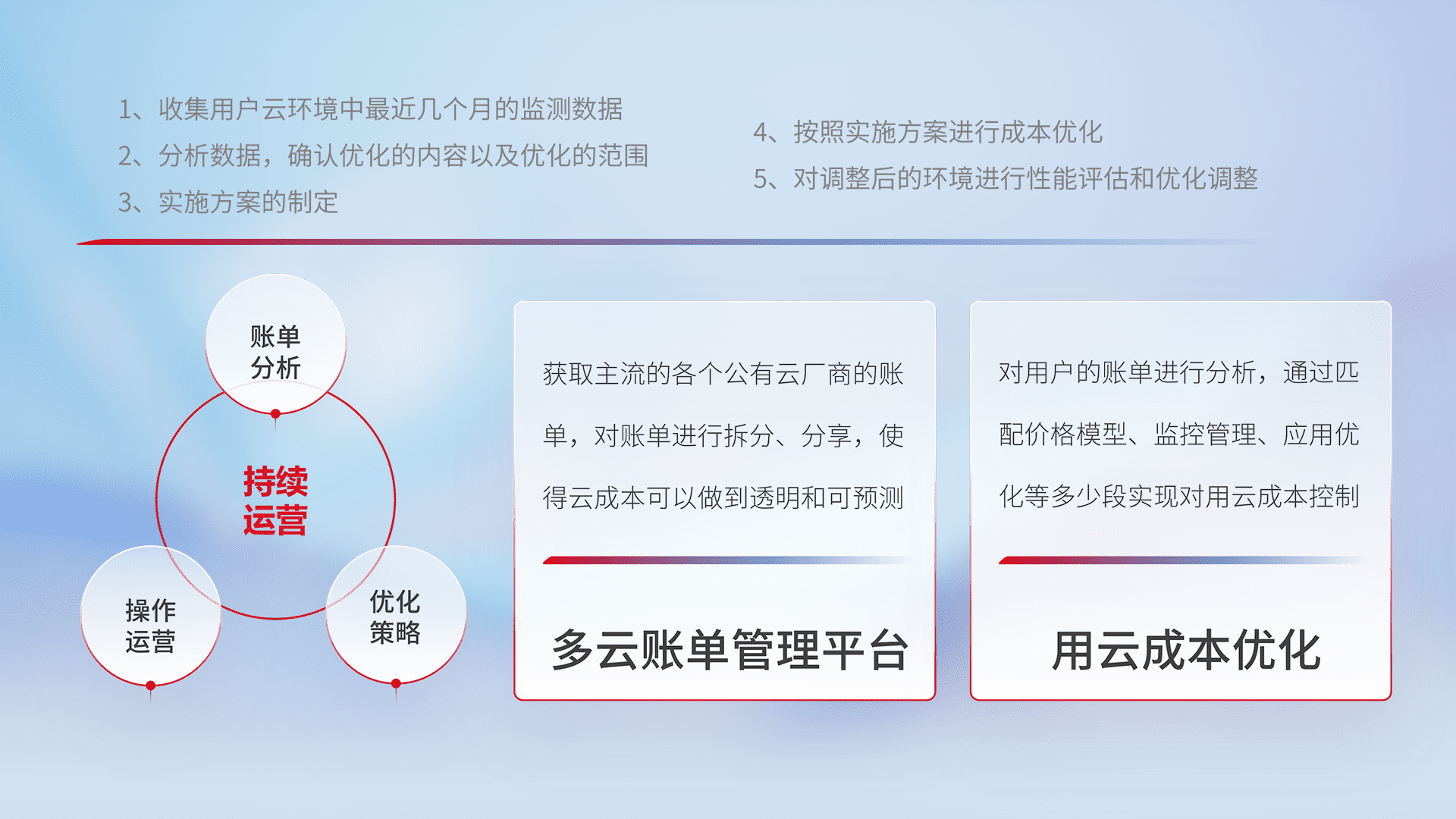 通过多云纳管,,,,以统一的资源数据模型把客户的云资源进行抽象和封装,,进而实现对多云资源的统一操作,,保障云资源管理的可靠性、、稳定性与可用性。。。量身定制化运维内容,,配置、、开发运维、、、补丁管理、、、、备份、、监控、、、认证和访问管理、、、、审计和日常巡检等,,,保障在用云过程中的可靠度,,稳定度以及高可用率。。。。